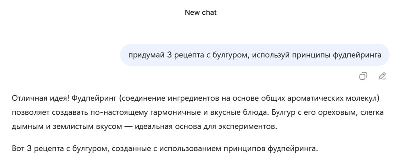В эру нейросетей это становится довольно просто. Всегда можно запросить у доступной нейросети идеи для своих кулинарных экспериментов. Для этого достаточно обозначить основной ингредиент будущего блюда (например, мясо, крупа, овощи и тд) и попросить ИИ предложить рецепты, в которых будет применен принцип фудпейринга.