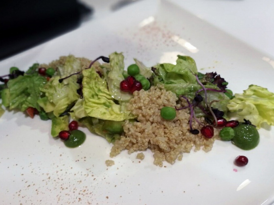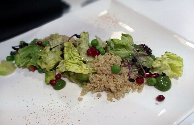 Готовые овощи пюрируем с небольшим количеством бульона, с добавлением соли и перца. Полученный соус процеживаем через сито. Киноа готовим в бульоне, оставшемся после горошка и шпината. Подготавливаем салат айсберг, нарываем его кусочками 2х2 см. Разбираем гранат на зерна. В миске смешиваем листья салата, киноа, зерна граната и зеленый горошек, добавляем оливковое масло.