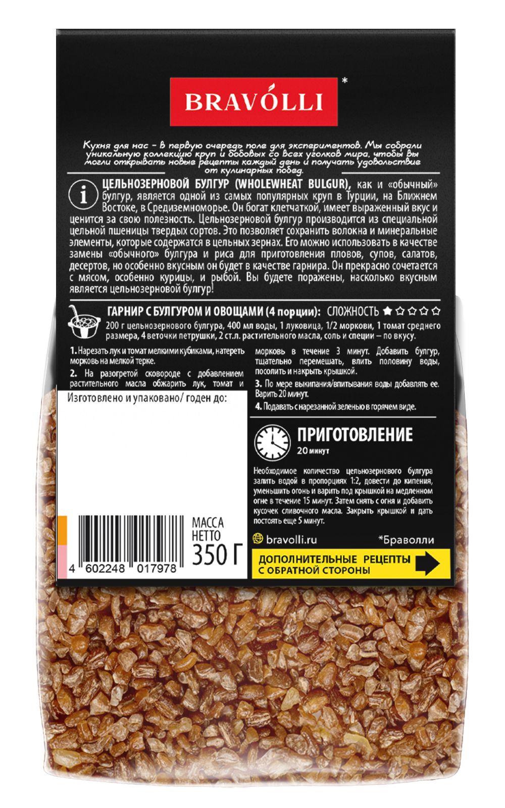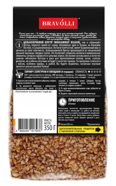ЦЕЛЬНОЗЕРНОВОЙ БУЛГУР (WHOLEWHEAT BULGUR), как и «обычный» булгур, является одной из самых популярных круп в Турции, на Ближнем Востоке, в Средиземноморье. Он богат клетчаткой, имеет выраженный вкус и ценится за свою полезность. Цельнозерновой булгур производится из специальной цельной пшеницы твердых сортов. Это позволяет сохранить волокна и минеральные элементы, которые содержатся в цельных зернах. Его можно использовать в качестве замены «обычного» булгура и риса для приготовления пловов, супов, салатов, десертов, но особенно вкусным он будет в качестве гарнира. Он прекрасно сочетается с мясом, особенно курицы, и рыбой. Вы будете поражены, насколько вкусным является цельнозерновой булгур!