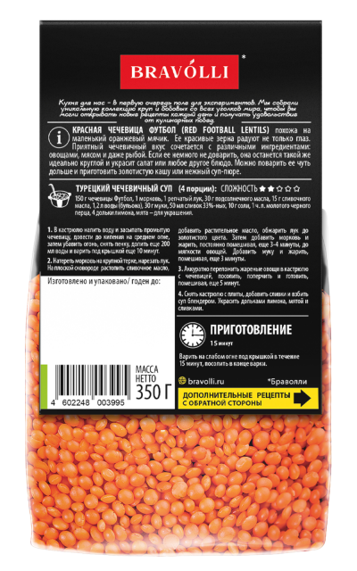 Красная чечевица футбол (red football lentils) похожа на маленький оранжевый мячик. Ее красивые зерна радуют не только глаз. Приятный чечевичный вкус сочетается с различными ингредиентами: овощами, мясом и даже рыбой. Если ее немного не доварить, она останется такой же идеально круглой и украсит салат или любое другое блюдо. Можно поварить ее чуть дольше и приготовить золотистую кашу или нежный суп-пюре.