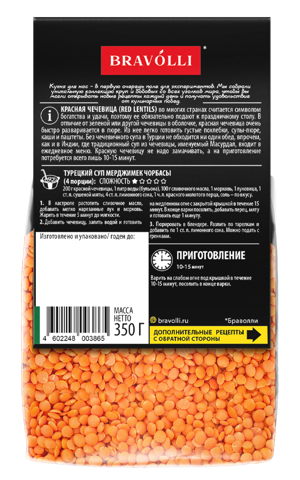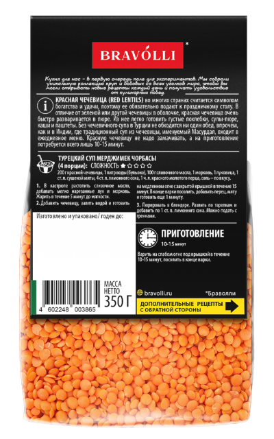 КРАСНАЯ ЧЕЧЕВИЦА (RED LENTILS) во многих странах считается символом богатства и удачи, поэтому ее обязательно подают к праздничному столу. В отличие от зеленой или другой чечевицы в оболочке, красная чечевица очень быстро разваривается в пюре. Из нее легко готовить густые похлебки, супы-пюре, каши и паштеты. Без чечевичного супа в Турции не обходится ни один обед, впрочем, как и в Индии, где традиционный суп из чечевицы, именуемый Масурдал, входит в ежедневное меню. Красную чечевицу не надо замачивать, а на приготовление потребуется всего лишь 10-15 минут.