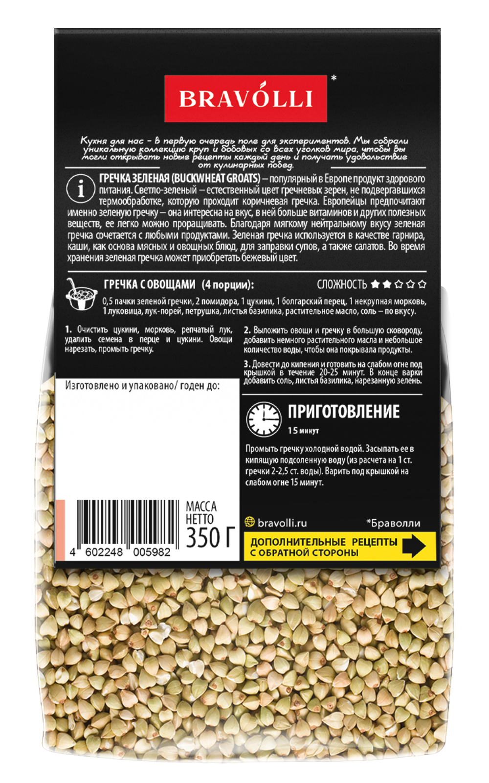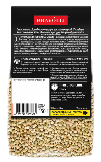 ГРЕЧКА ЗЕЛЕНАЯ (BUCKWHEAT GROATS) – популярный в Европе продукт здорового питания. Светло-зеленый – естественный цвет гречневых зерен, не подвергавшихся термообработке, которую проходит коричневая гречка. Европейцы предпочитают именно зеленую гречку – она интересна на вкус, в ней больше витаминов и других полезных веществ, ее легко можно проращивать. Благодаря мягкому нейтральному вкусу зеленая гречка сочетается с любыми продуктами. Зеленая гречка используется в качестве гарнира, каши, как основа мясных и овощных блюд, для заправки супов, а также салатов. Во время хранения зеленая гречка может приобретать бежевый цвет.