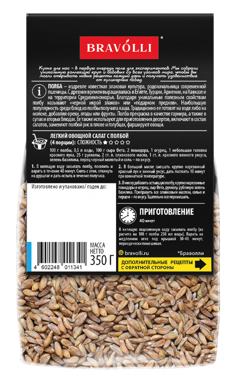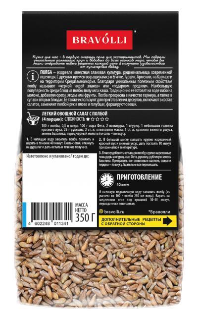ПОЛБА – издревле известная злаковая культура, родоначальница современной пшеницы. С древних времен выращивалась в Египте, Турции, Армении, на Кавказе и на территории Средиземноморья. Благодаря уникальным полезным свойствам полбу называют «черной икрой злаков» или «подарком предков». Наибольшую популярность среди блюд из полбы получила каша. Традиционно ее готовят на воде либо на молоке, добавляя орехи, ягоды или фрукты. Полба прекрасна в качестве гарнира, а также в супах и вторых блюдах. Ее также используют для приготовления десертов, включают в состав салатов, заменяют полбой рис в плове и голубцах, фаршируют овощи.