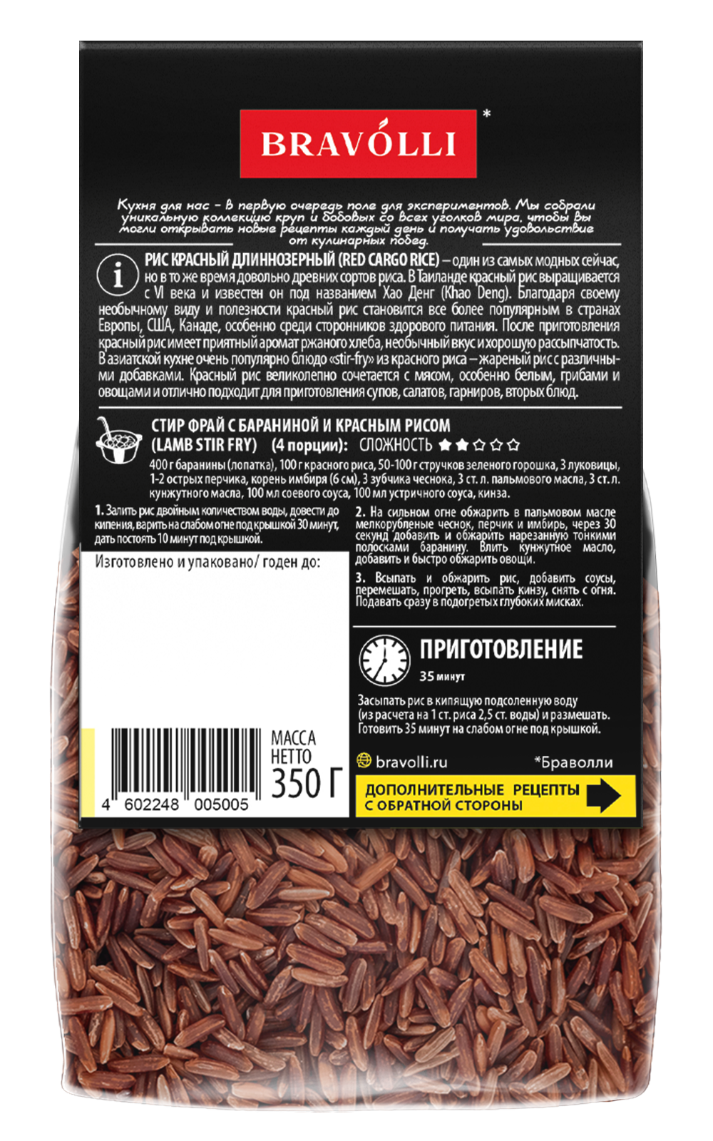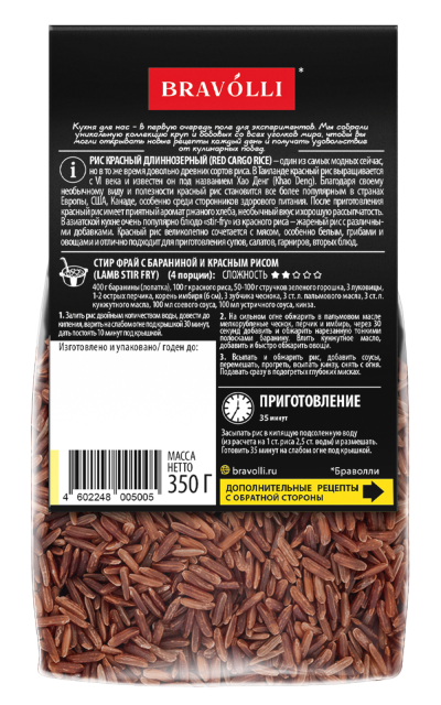 РИС КРАСНЫЙ ДЛИННОЗЕРНЫЙ (RED CARGO RICE) – один из самых модных сейчас, но в то же время довольно древних сортов риса. В Таиланде красный рис выращивается с VI века и известен он под названием Хао Денг (Khao Deng). Благодаря своему необычному виду и полезности красный рис становится все более популярным в странах Европы, США, Канаде, особенно среди сторонников здорового питания. После приготовления красный рис имеет приятный аромат ржаного хлеба, необычный вкус и хорошую рассыпчатость. В азиатской кухне очень популярно блюдо «stir-fry» из красного риса – жареный рис с различными добавками. Красный рис великолепно сочетается с мясом, особенно белым, грибами и овощами и отлично подходит для приготовления супов, салатов, гарниров, вторых блюд.