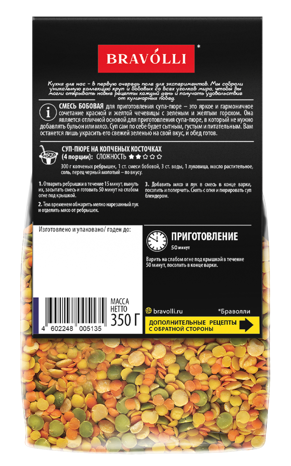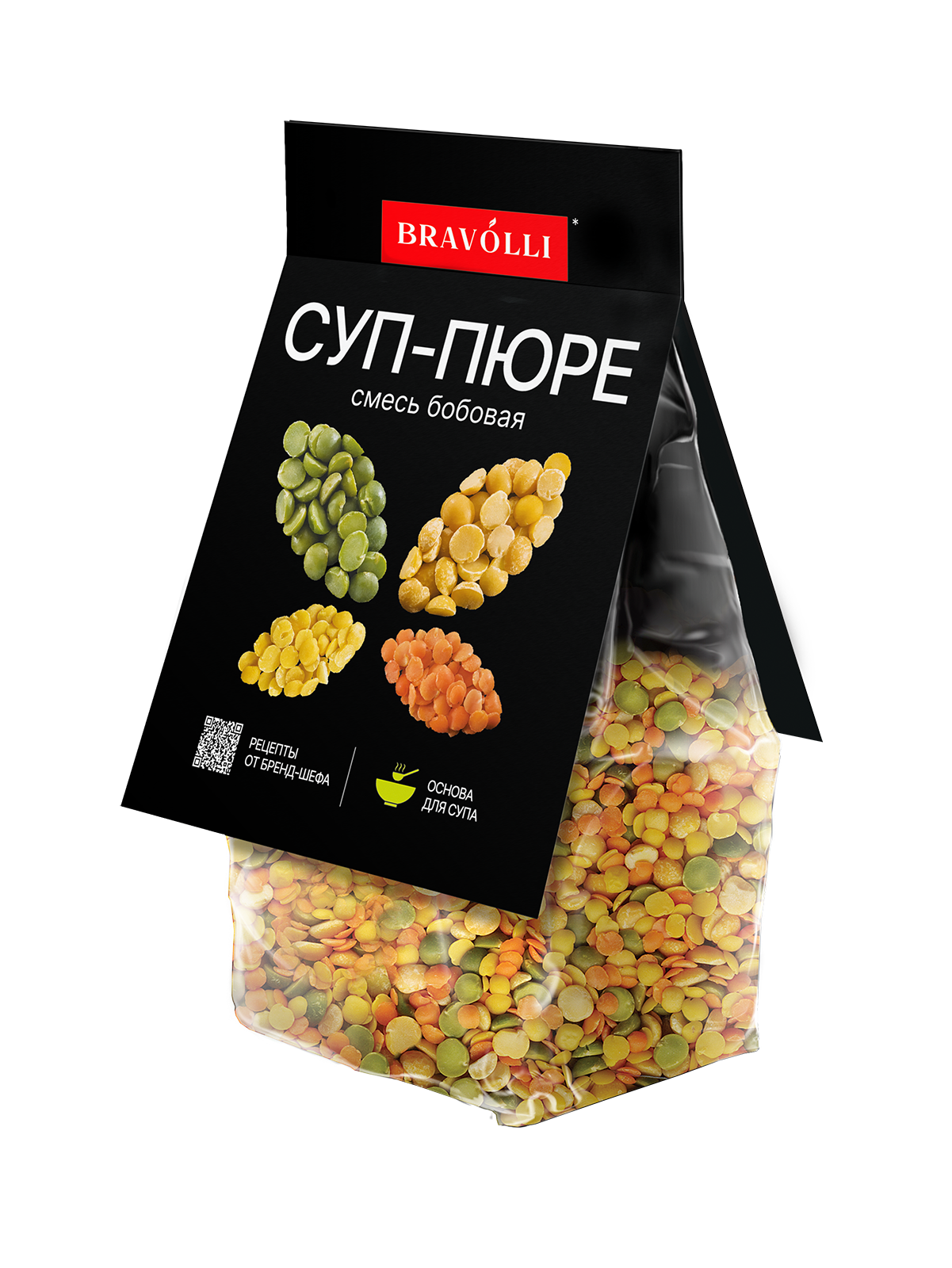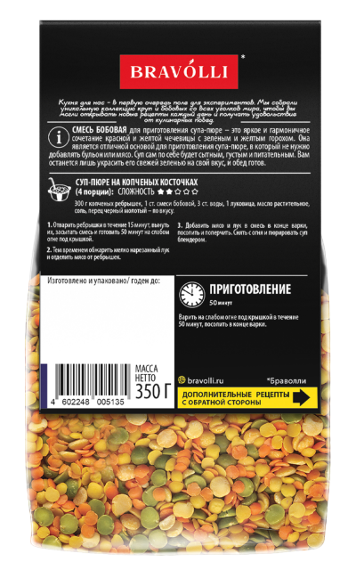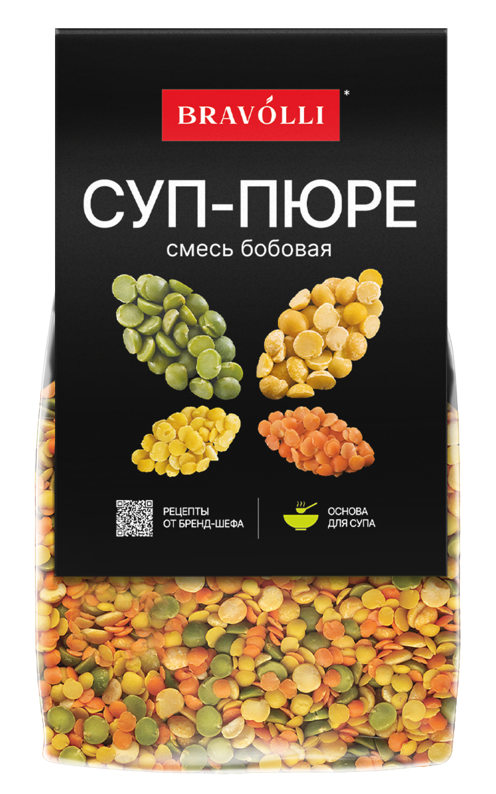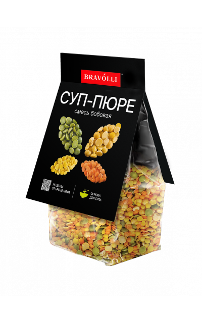 Смесь бобовая для приготовления супа-пюре – это яркое и гармоничное сочетание красной и желтой чечевицы с зеленым и желтым горохом. Она является отличной основой для приготовления супа-пюре, в который не нужно добавлять бульон или мясо. Суп сам по себе будет сытным, густым и питательным. Вам останется лишь украсить его свежей зеленью на свой вкус, и обед готов.
