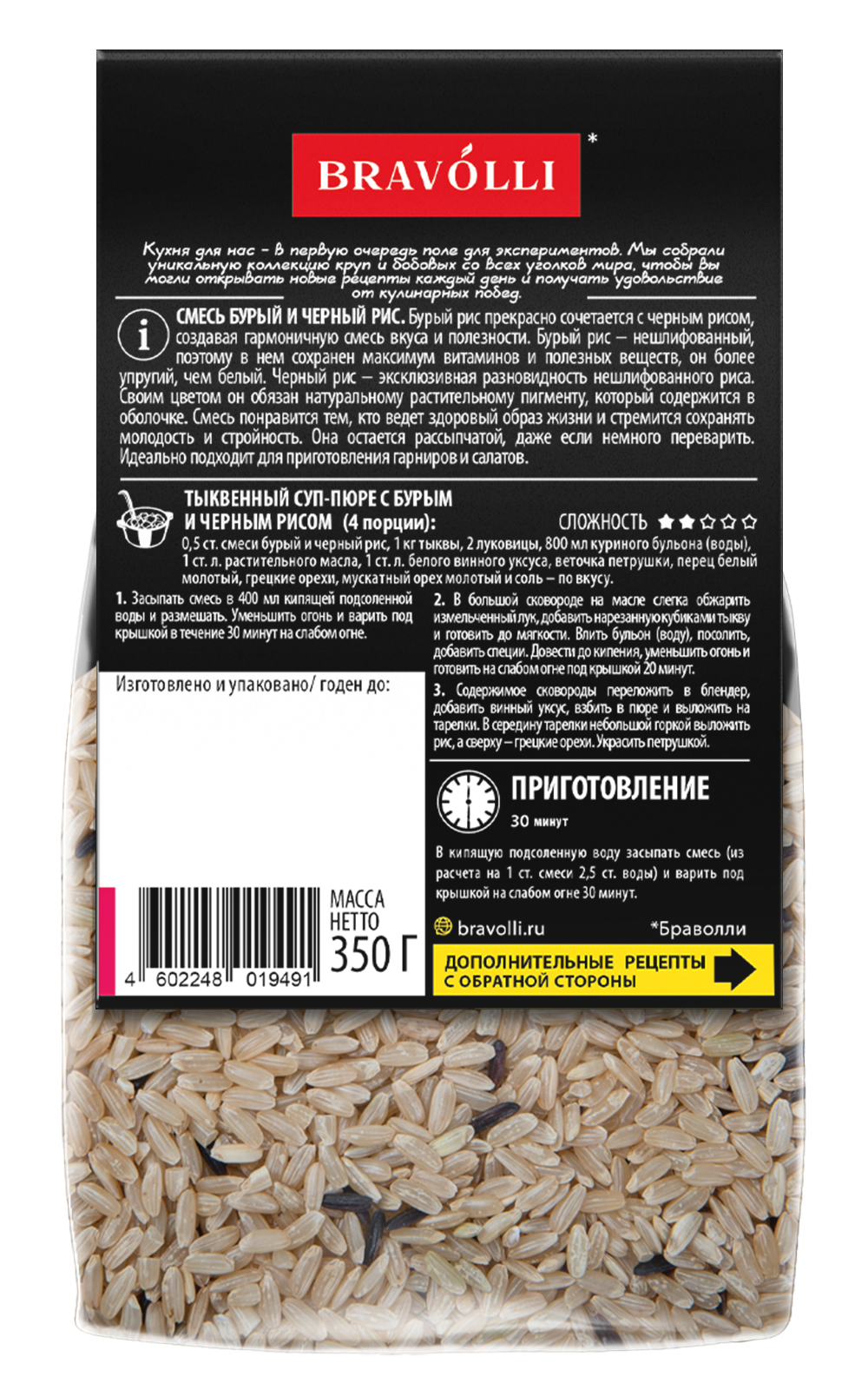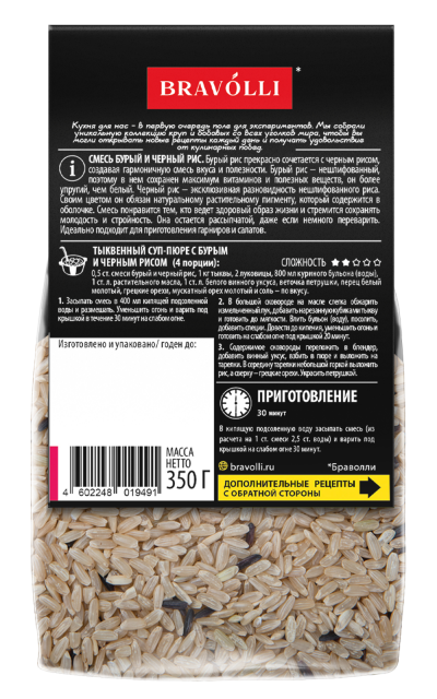Бурый рис прекрасно сочетается с черным рисом, создавая гармоничную смесь вкуса и полезности. Бурый рис – нешлифованный, поэтому в нем сохранен максимум витаминов и полезных веществ, он более упругий, чем белый. Черный рис – эксклюзивная разновидность нешлифованного риса. Своим цветом он обязан натуральному растительному пигменту, который содержится в оболочке. Смесь понравится тем, кто ведет здоровый образ жизни и стремится сохранять молодость и стройность. Она остается рассыпчатой, даже если немного переварить. Идеально подходит для приготовления гарниров и салатов.