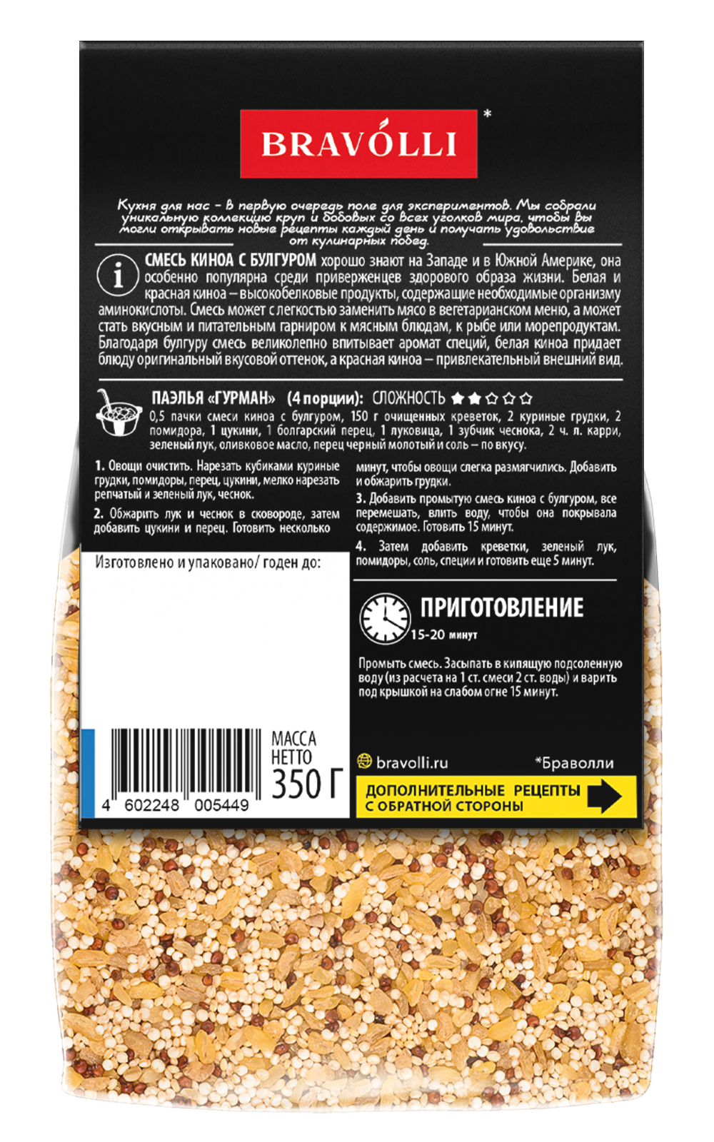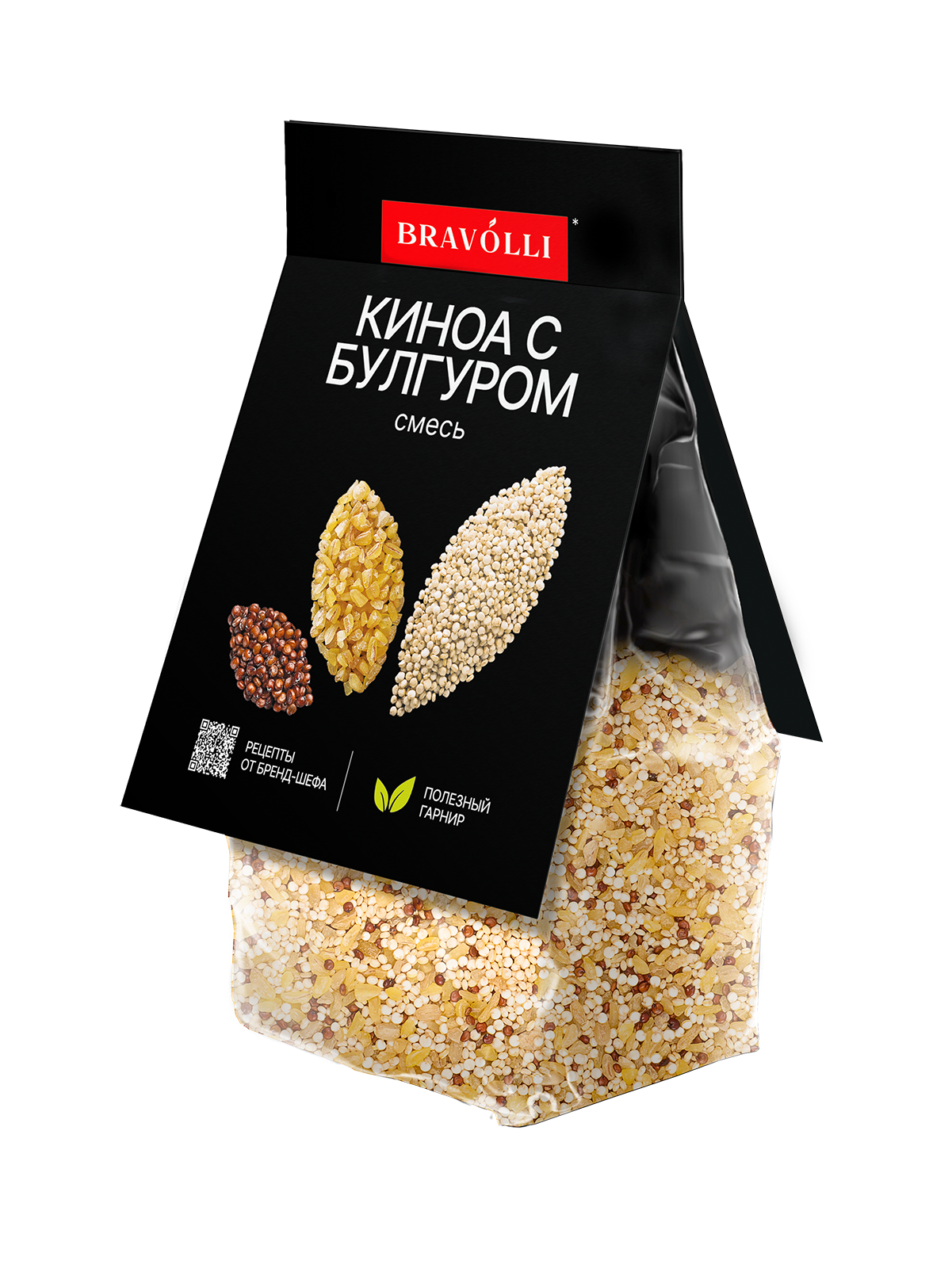 Смесь киноа с булгуром хорошо знают на Западе и в Южной Америке, она особенно популярна среди приверженцев здорового образа жизни. Белая и красная киноа – высокобелковые продукты, содержащие необходимые организму аминокислоты. Смесь может с легкостью заменить мясо в вегетарианском меню, а может стать вкусным и питательным гарниром к мясным блюдам, к рыбе или морепродуктам. Благодаря булгуру смесь великолепно впитывает аромат специй, белая киноа придает блюду оригинальный вкусовой оттенок, а красная киноа – привлекательный внешний вид.