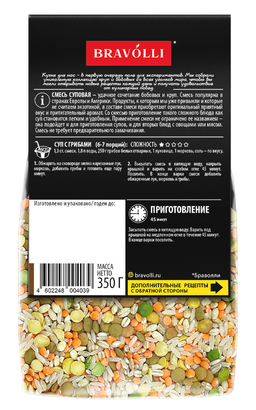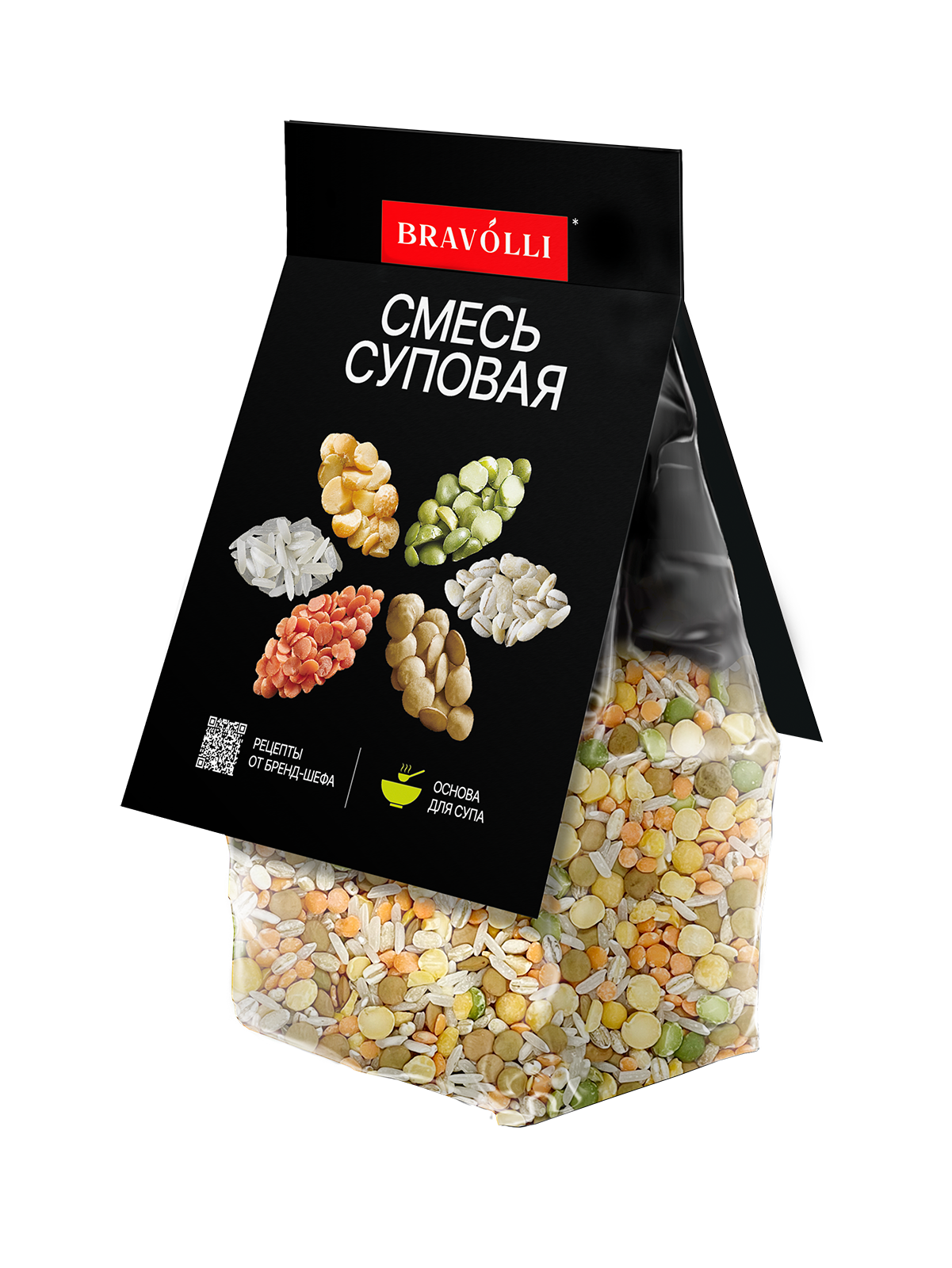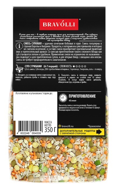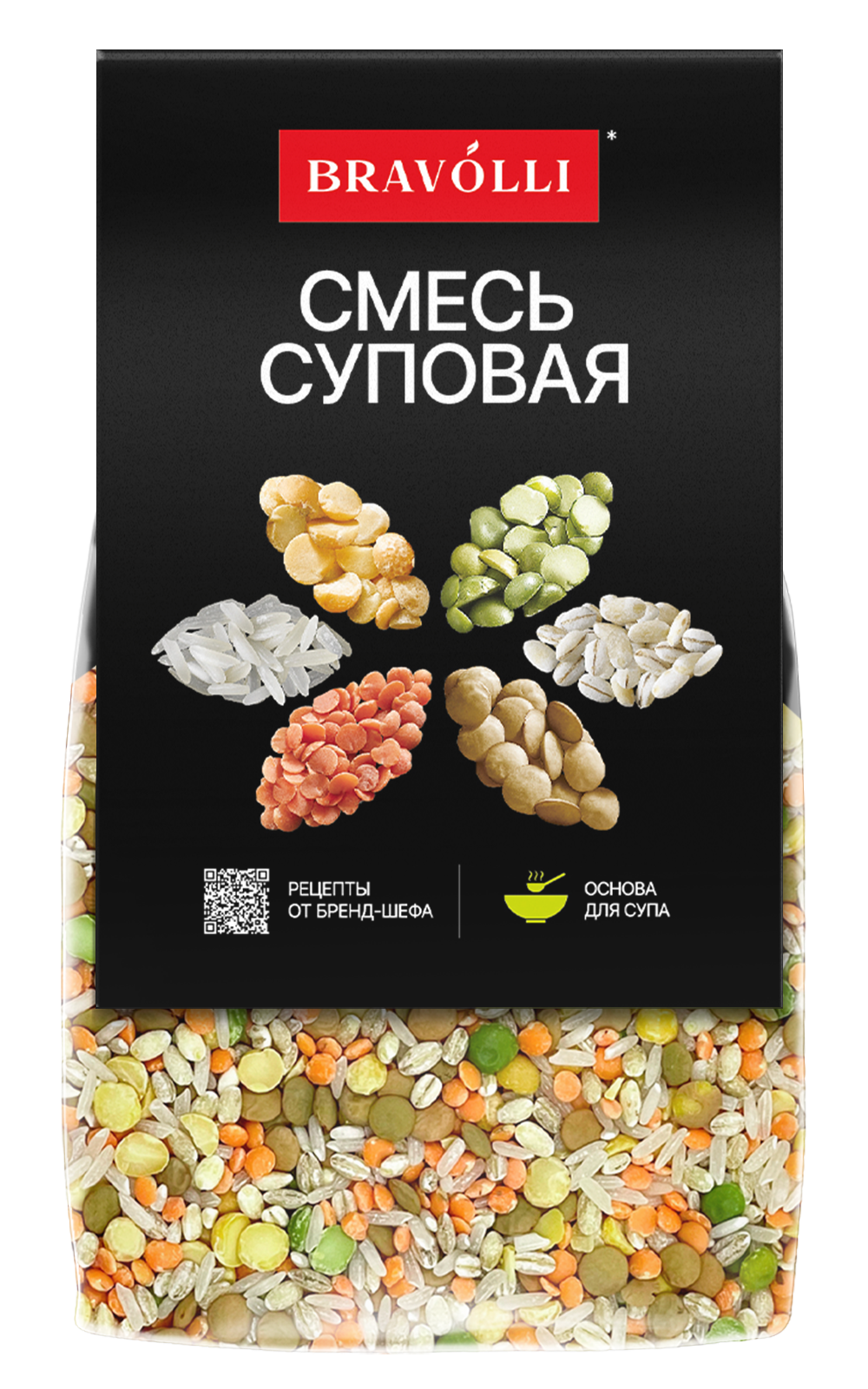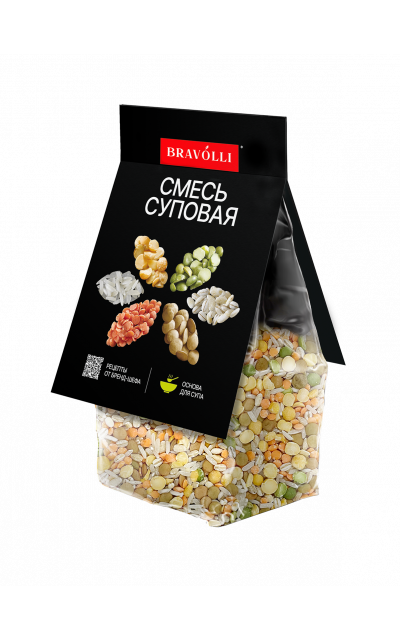Смесь суповая – удачное сочетание бобовых и круп. Смесь популярна в странах Европы и Америки. Продукты, к которым мы уже привыкли и которые не считаем экзотикой, в составе смеси приобретают оригинальный приятный вкус и притягательный аромат. Со смесью приготовление такого сложного блюда как суп становится легким и удобным. Применение смеси не ограничено ее названием – она подойдет и для приготовления супов, и для вторых блюд с овощами или мясом. Смесь не требует предварительного замачивания.