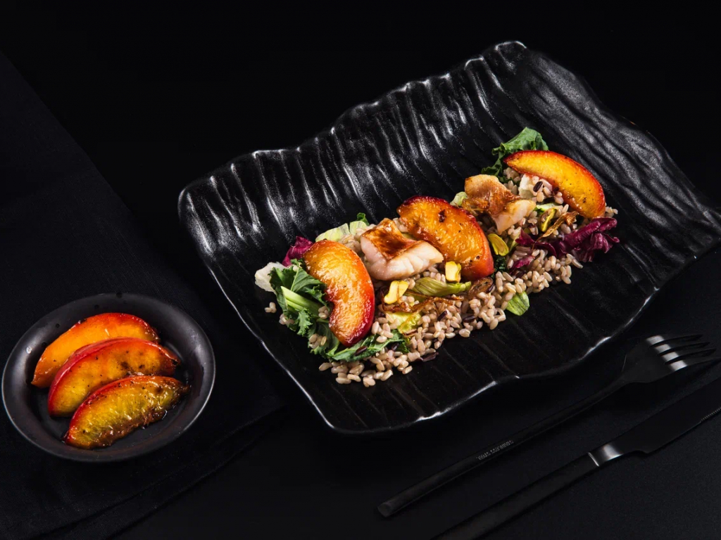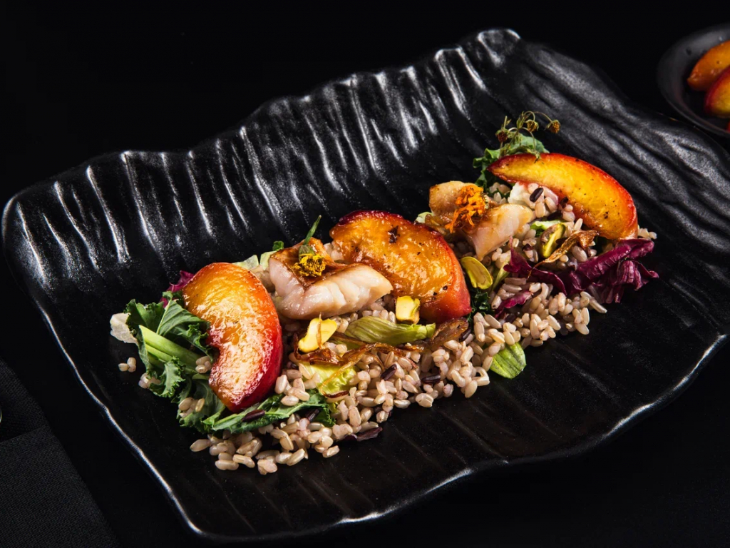 Фруктовый салат с печеными персиками и белой рыбой с карамельным луком