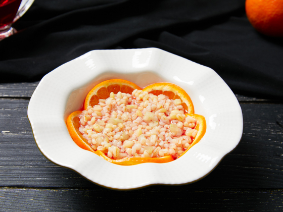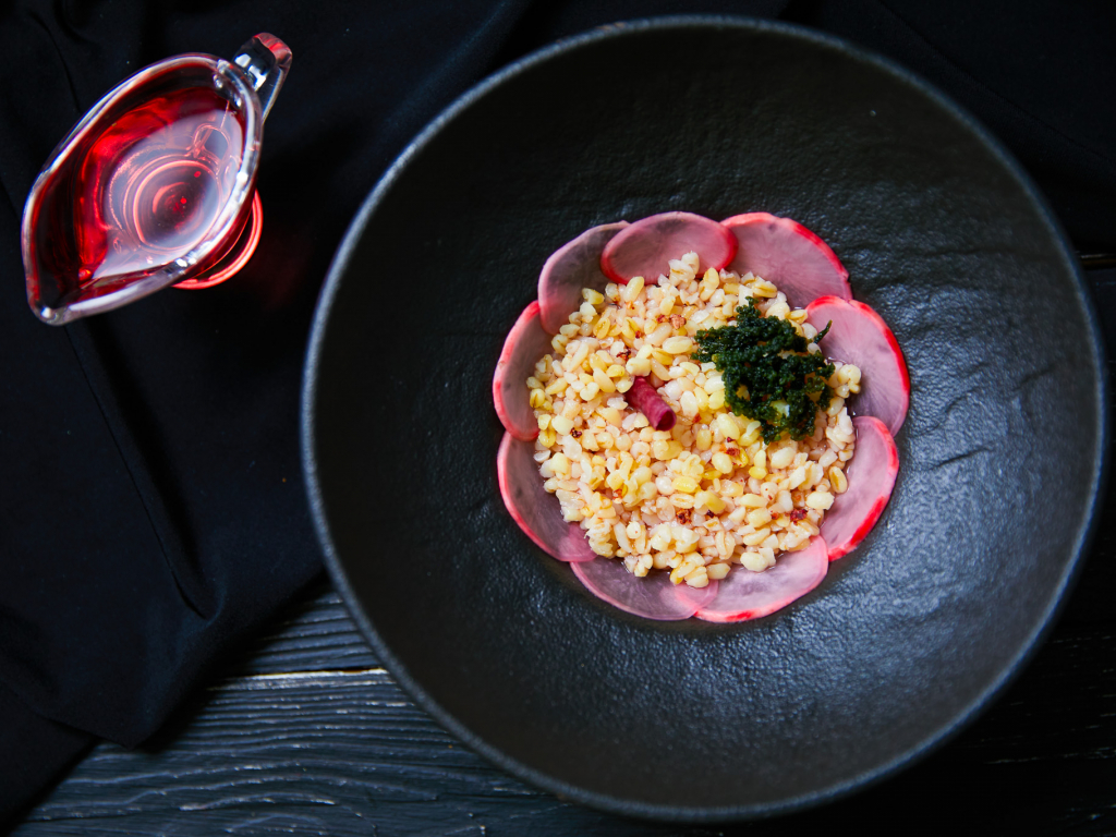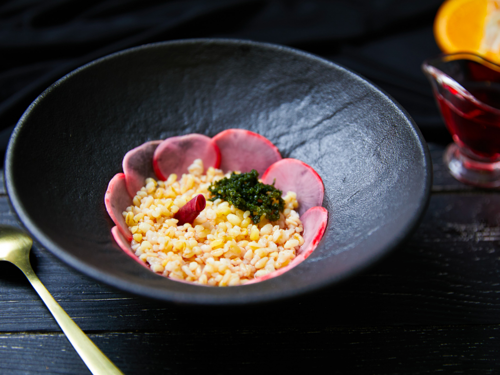 Угощайтесь блюдом в холодном виде, подцепив на вилку редис, кусочек винограда и булгур одновременно.