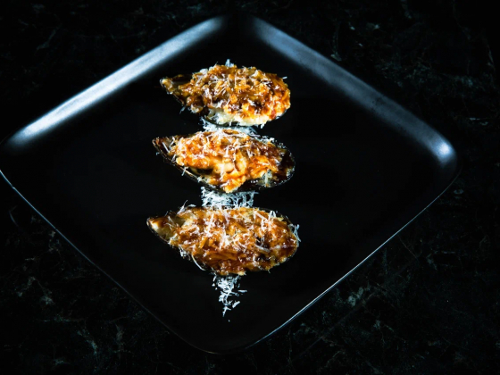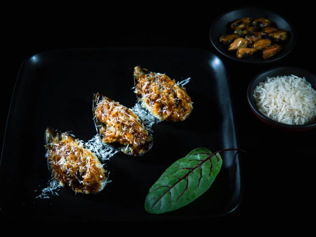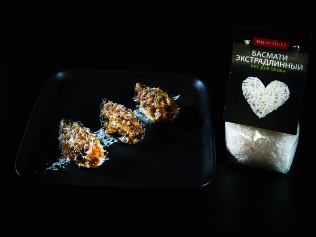 Столовой ложкой выложить смесь риса и сыра на мидии в створках.