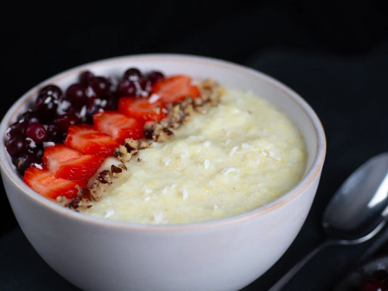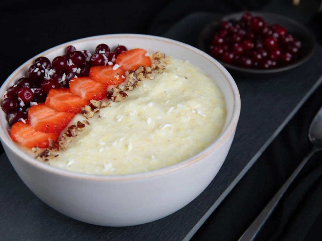Миндальная каша с клюквой и клубникой