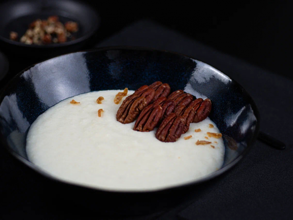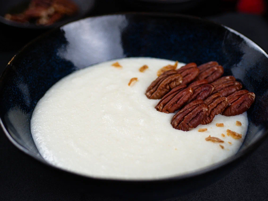Медленно засыпать поленту, добавить орехи и варить 8-10 минут на среднем огне, постоянно помешивая.