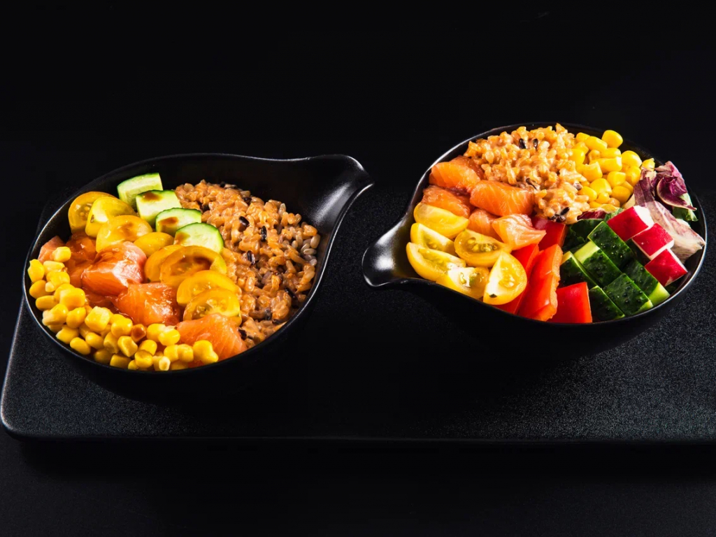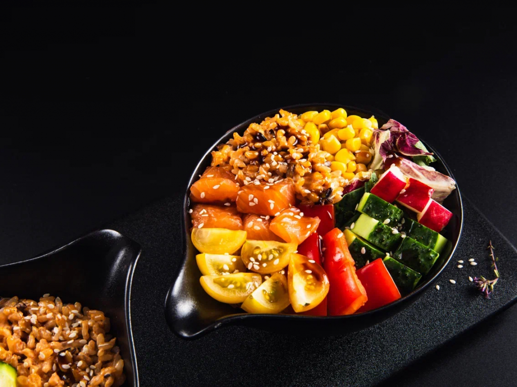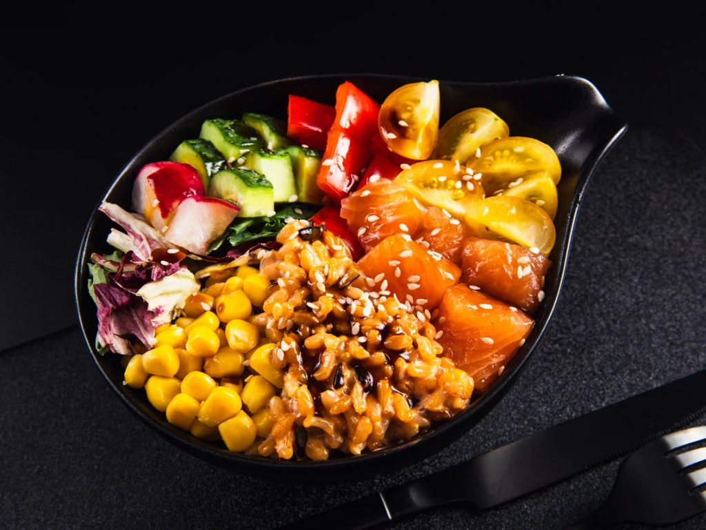 Смешать шрирачу и майонез, заправить рис соусом и положить в глубокую тарелку. Сверху кластерами (сегментами) поместить рыбу, овощи, консервированную кукурузу и еще раз немного заправить соусом.