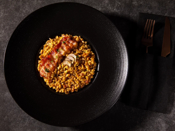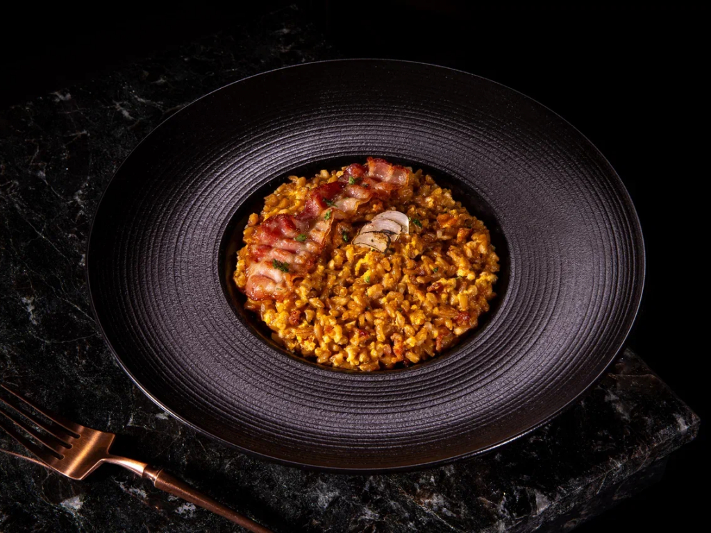 Добавить в бекон сваренную полбу и смесь желтков и сыра. Долить немного воды, оставшейся после варки полбы.