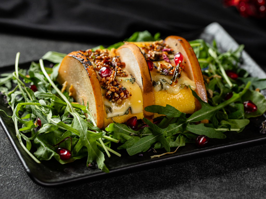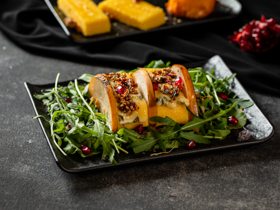 Идея фудпейринга: Сливочная сладковатая полента становится идеальным фоном для яркого и сложного сыра с плесенью. Сладкая сочная груша смягчает его остроту, а грецкий орех добавляет горьковатый оттенок и хруст, создавая идеальный баланс соленого, сладкого и горького.