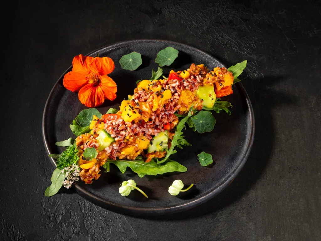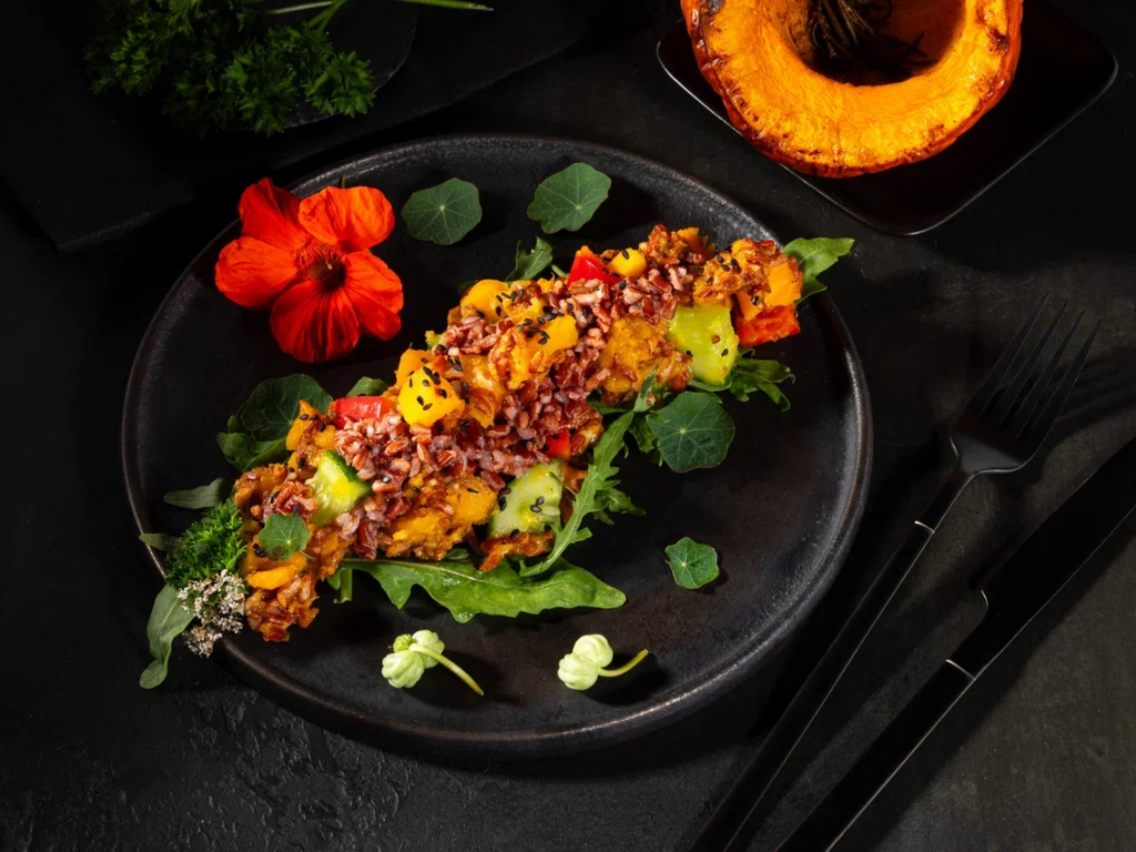 Салат из запеченной тыквы со свежими овощами и красным рисом