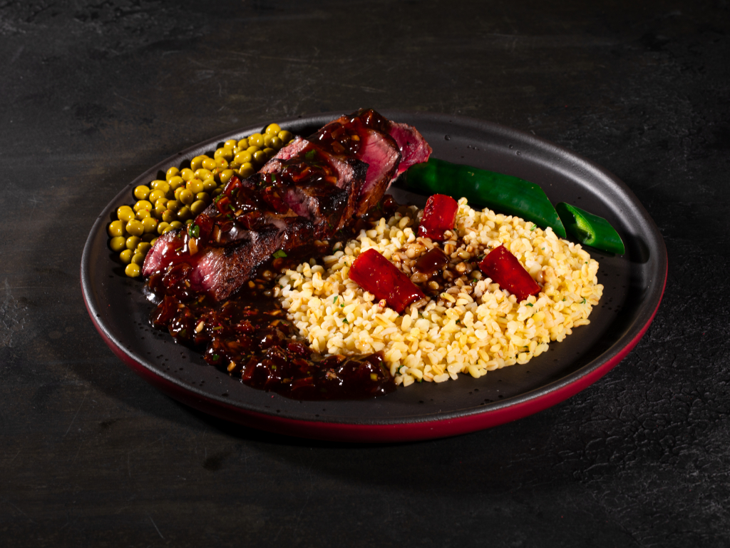 На тарелку выложить рядом булгур и стейк, обильно полить соусом.
