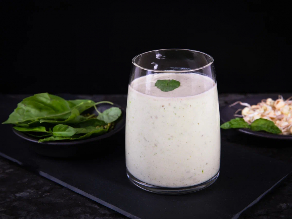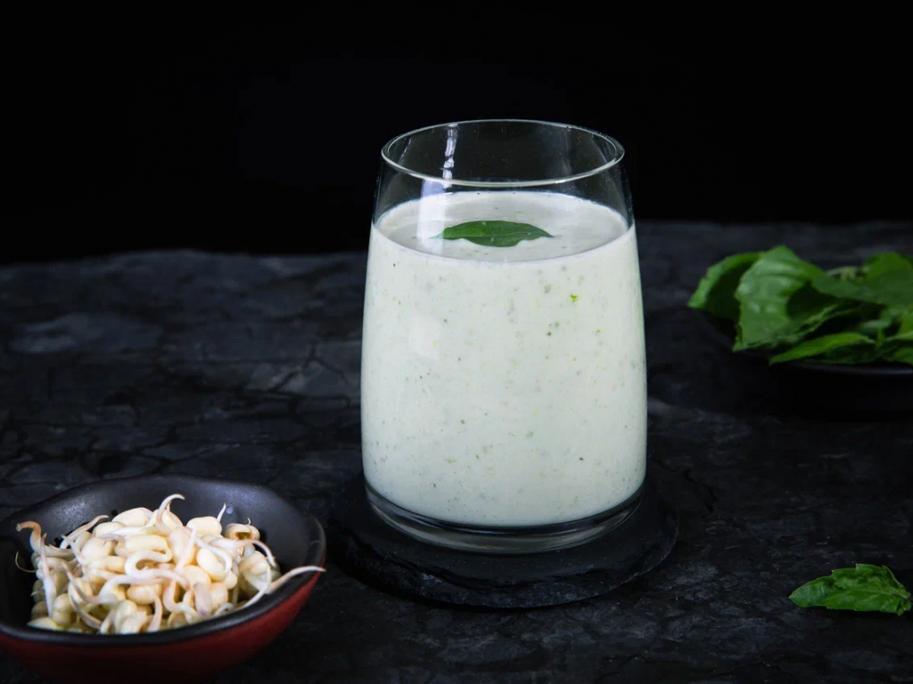 Смешать все ингредиенты в чаше блендера и блендировать. Охладить, перемешать и выпить.