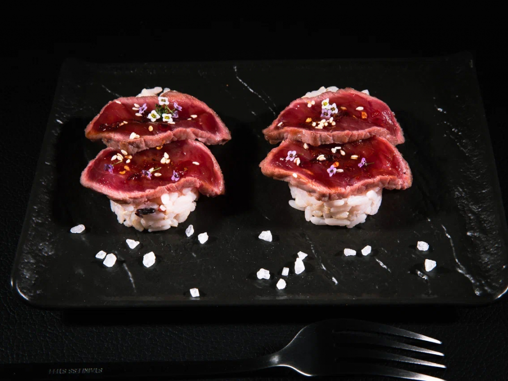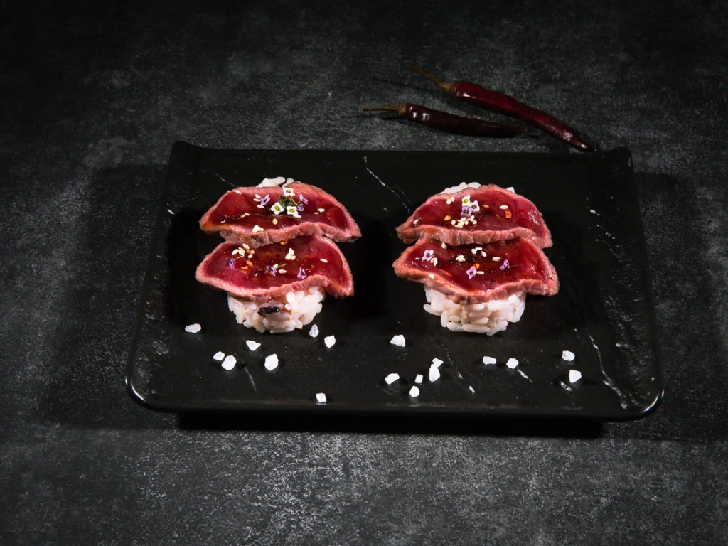 Подавать, тонко нарезав говядину поперек и выложив на рис.