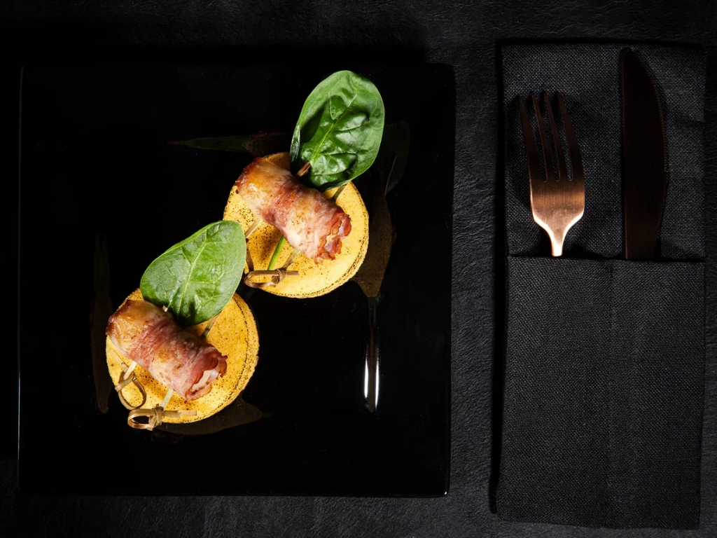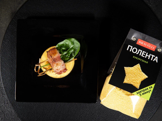 Из охлажденной смеси поленты с сыром и маслом вырезать кулинарным кольцом 4 фрагмента, выложить на каждый из них рулет из бекона с гребешком.