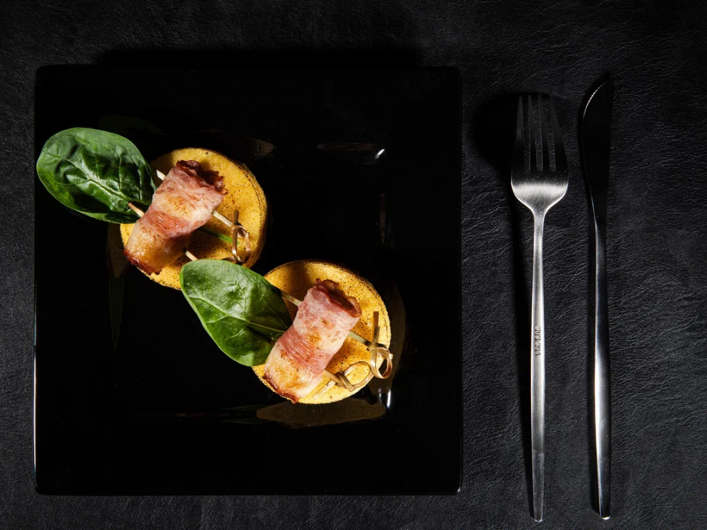 В это время положить гребешки на бекон, плотно свернуть, сформировав рулетики, и закрепить шпажками, чтобы они не раскрутились при запекании.