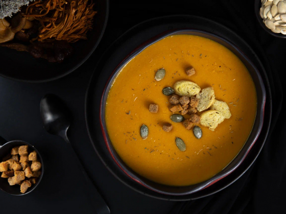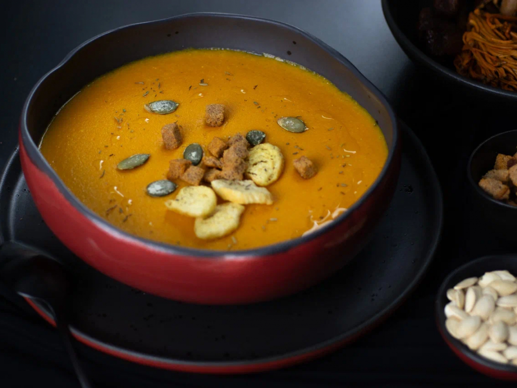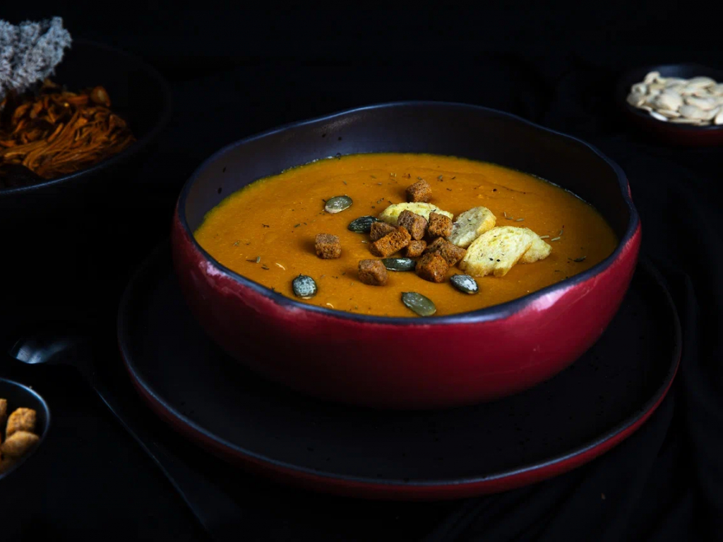 Подавать с любимой зеленью, сухариками или тыквенными семенами.