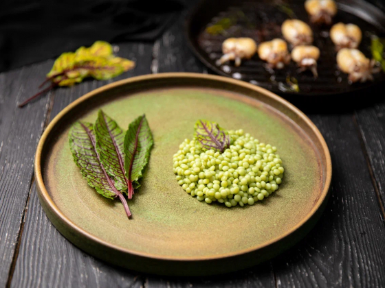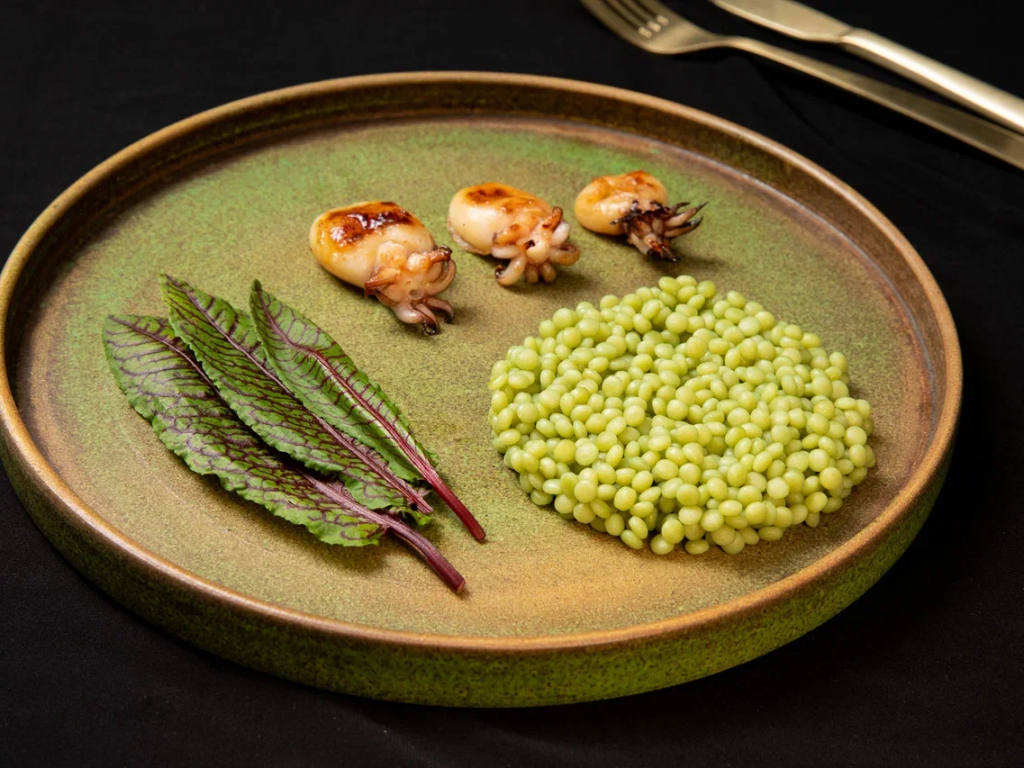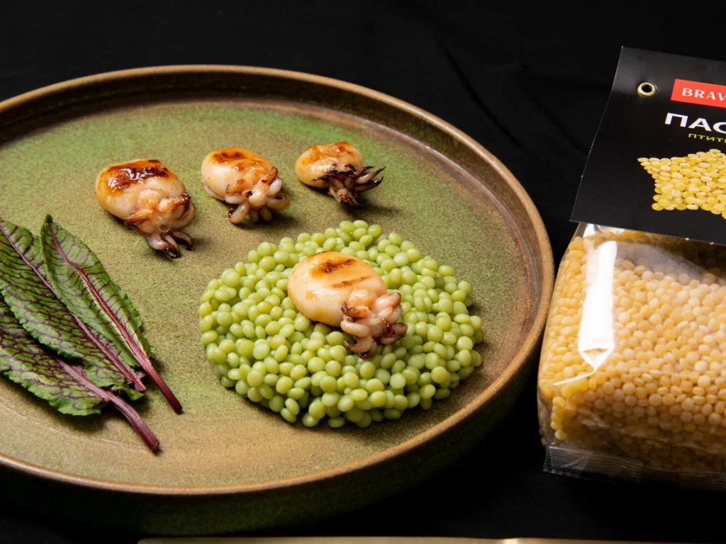 Пока варится птитим, на разогретой сковороде-гриль с добавлением сливочного масла обжарить кальмары, смазанные соусом терияки, по 40 секунд с каждой стороны. Сдобрить черным молотым перцем.