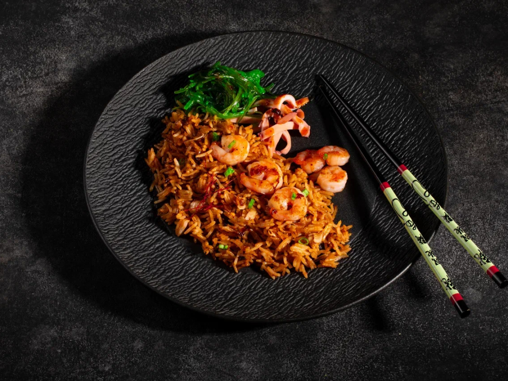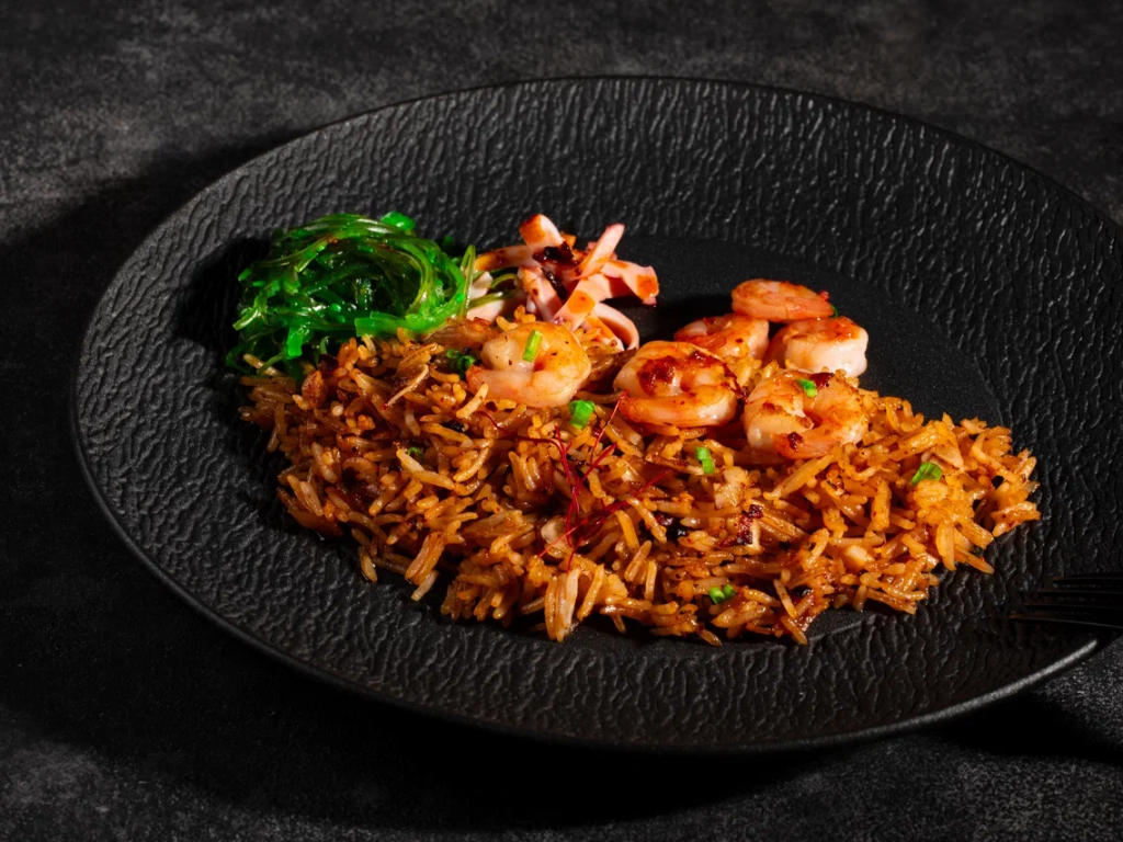 Когда рис станет румяным, добавить морепродукты и перемешать.
